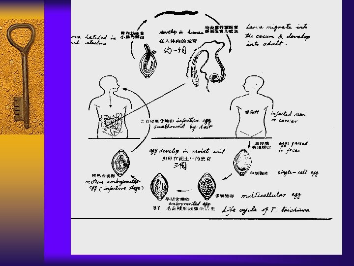 II. Life Cycle: 1. Site of inhabitation: cecum 2. Infective stage: embryonic egg 3. Infectve mode and route: passively swallowed by the mouth 4. Without intermediate host and reservoir host 5. The life span of the adult is about 3 -5 years. Adults deposit Eggs 3 weeks invade the intestinal wall develop 3 -10 days Infective eggs ingested by man return to the intestinal lumen larvae hatch out in small intestine Adults