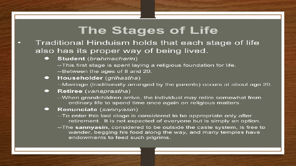 Four Stages of Life Stage One: Student stage Stage Two: Householder Stage Three: Forest-dweller --after the birth of first grandchild Stage Four: Sannyasin - wondering ascetic