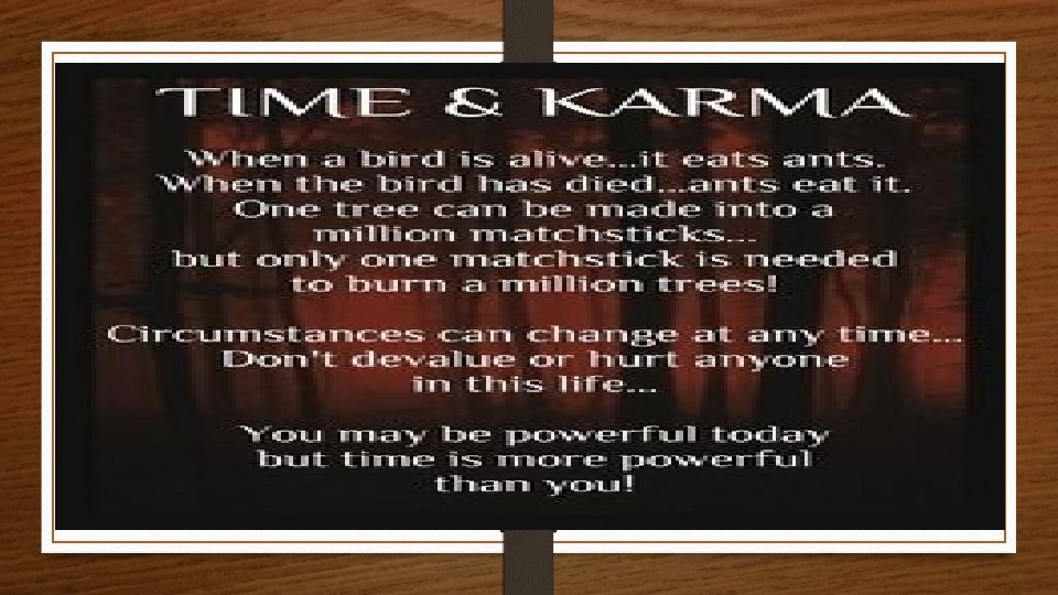 Karma & Dharma v. Karma: “action” or “deeds” v. Every action produces a justified effect based on its moral worthiness. v. Karma determines all the particular circumstances and Situations of one’s life. v. Dharma: ethical duty based on the divine order of reality. The word is the closest equivalent to “religion. ”