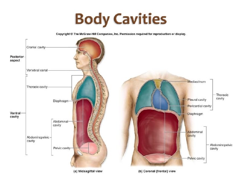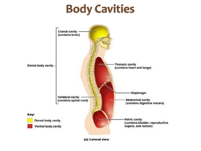 Body Cavities Dorsal = back side Ventral = front side Thoracic = chest (heart, trachea, lungs. . ) Abdomen = stomach area (spleen, intestines) Pelvic = lower abdomen (bladder, reproductive organs) DIAPHRAGM: Separates the thoracic and pelvic region