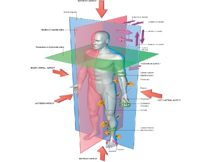 ANATOMICAL PLANES • Sagittal plane is vertical plane that passes through the body from front to back. • The median or midsagittal plane is the vertical plane that divides the body into right and left halves. • Coronal plane is vertical plane which pass through the body from side to side. • Horizontal (transverse) plane is parallel to the floor.