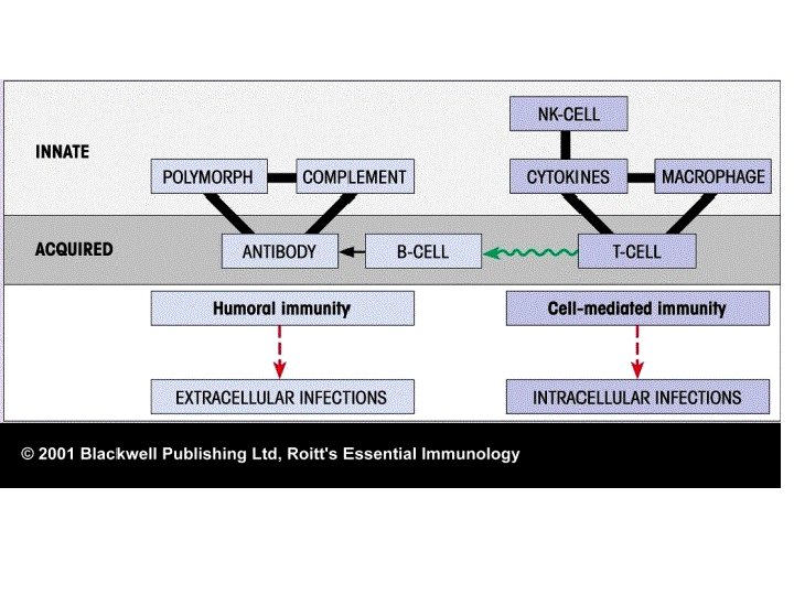 • The link between innate and adaptive immunity 1. The innate stimulate the adaptive ( macrophage secret IL-12 and/ or IL-4 that activate T cells. C 3 d complement activate B cell. Antigen presentation to T cell by macrophages. 2. The adaptive immune response use some innate cells to eliminate the antigen (T cells secret IFN gamma that activate macrophages)