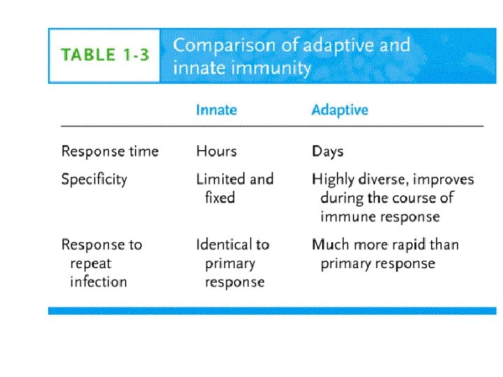 Innate and Adaptive • Innate immune response is better than adaptive in recognizing self from non-self. • Innate immune responses to a microbe are immediate and do not require prior exposure to the microbe • effective adaptive immune responses to a newly introduced microbe develop over several days as clones of T and B lymphocytes that activated by some activated innate cells undergo expansion and differentiate into functional effector Th and Tc cells and antibody producing B cells.
