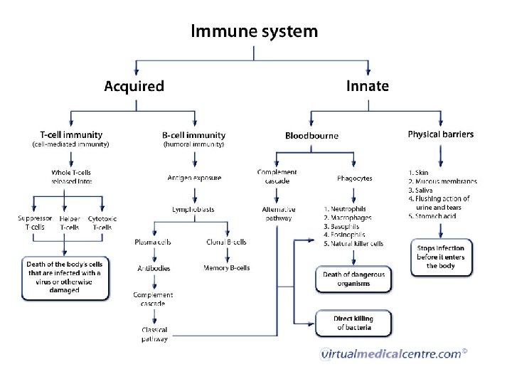 Immunity in practice – Defense system evolved to prevent or limit invasion of infectious agents, non infectious particles as protein and lipid macromolecules and cancerous cells – The innate immune system ( the first to act; complements and cells), • • • present and act the same in all people against general antigens. it is monotonic; the same magnitude and speed of response each time, not specific, act against common microbial antigens. . – The second is adaptive immune system (T and B cells), • • it is specific act against certain antigen, increasing in magnitude and speed of response in re-exposure to the same antigen (memory) – Innate immune response is better than adaptive in recognizing self from non-self