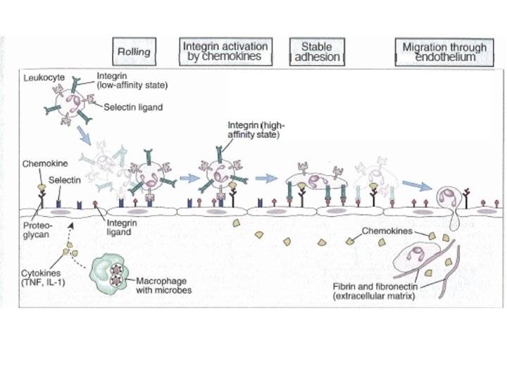 Cell chemotaxis v Recruitment of phagocytes to site of infection – Follow chemotactic factors gradient(C 3 a, C 5 a, AND IL-8) produced by resident macrophages and phospholipids and peptides of bacteria, they migrate by • Capture and rolling; enhance adhesion molecules on both endothelial and innate immune cells • enhance the strength of binding of interacting molecules on both endothelium and leucocytes that make the leukocyte flatten • Extravasation to site of infection. First neutrophils then macrophages. activated T cells migrate in the same way