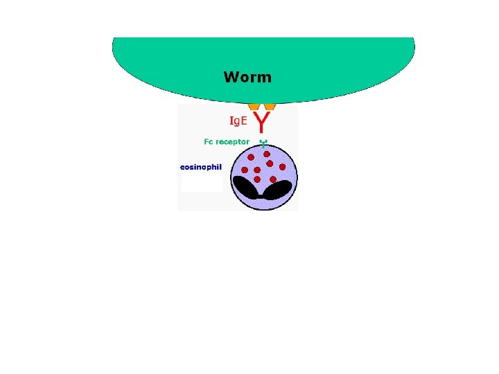 EOSINOPHILS • These cells are eosinophilic or "acid-loving" as shown by their affinity to coal tar dyes: Normally transparent, it is this affinity that causes them to appear brick-red after staining with eosin, a red dye, • Eosinophils kill extracellularly • 2 functions – When eosinophils bind to Ig. E on the surface of a worm, the cell is triggered to degranulate. The contents of the granules cause damage to the worm. – Other function is in allergy. • There are many hydrolytic enzymes present in the granules responsible for the anti-helminthic activity. One component which is unique to the eosinophils - and highly toxic to worms - is a substance known as Major Basic Protein (MBP).