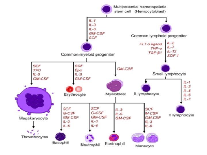 • Hematopoietic stem cells (HSCs) give rise to two kinds of multipotent progenitor cells, one that generates lymphoid another that produces myeloid cells, • The common lymphoid progenitor gives rise to committed precursors of T cell, B cell • The common myeloid-megakaryocyte- erythroid progenitors give rise to committed precursors of the erythroid, megakaryocytic, granulocytic, and monocytic lineages, • Stem cells express 2 main proteins, CD 34 and stem cell antigen-1 • Hematopoietic Cytokines called Colony stimulating factors are the influencing factors for stem cell differentiation and maturation e. g; G-CSF, M-CSF and GM-CSF
