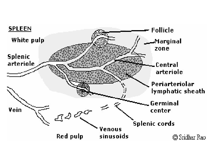 spleen • Weigh 150 g, in left upper quadrant • Immune response against blood borne antigens • Consist of white pulp(inner) – peri-arteriolar lymphoid sheath; PALS ( T cell Zone) – follicles (B cells zone). – Marginal zone in between red and white pulp, have both B and T cells and macrophages. • Red pulp; outer, splenic artery, vascular sinusoid, splenic vein. consist of old erythrocytes and macrophages, It is the place where aged RBC is destroyed by macrophages • The splenic artery enters the red pulp through a web of small blood vessels, and blood-borne microorganisms are trapped in this loose collection of cells until they are gradually washed out through the splenic vein • No afferent lymphatic vessel in spleen.