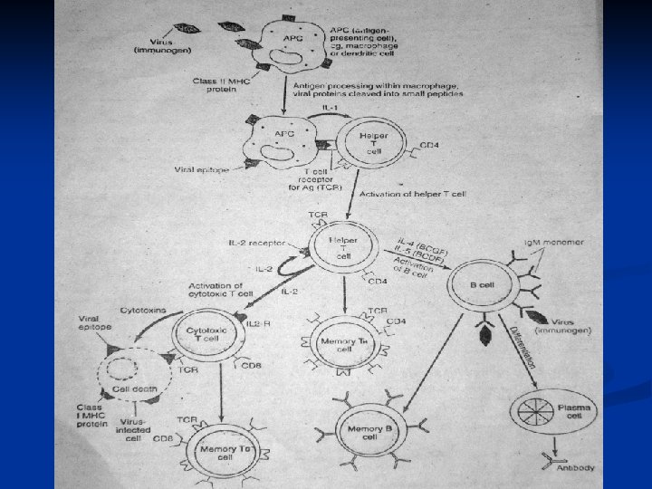 Major Functions Of T Cells and B cells Antibody-Mediated Immunity (B Cells) 1) Host defense against infection 2) 3) 4) (Opsonize bacteria, neutralize toxins and viruses) Allergy (hypersensitivity) eg, hay fever anaphylactic shock Autoimmunity Cell Mediated Immunity 1) Host defense against infection (especially M. tuberculosis, fungi and virus infected cells) 2) Allergy (hypersensitivity )eg poison oak 3) Graft and tumor rejection 4) Regulation of antibody response (help and suppression)