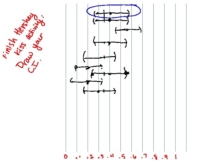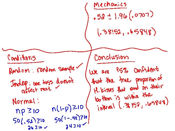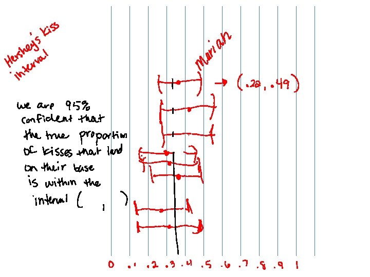 Hershey Kiss • Finish the worksheet- 10 minutes • The true proportion of Hershey kisses that land on their base is. 33 • Determine if your interval captures the true proportion • Write your interval on either green or pink paper (green= interval does capture, pink=interval does not capture) • Tape your paper to the board