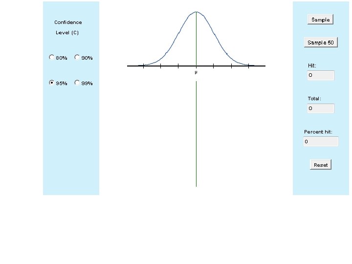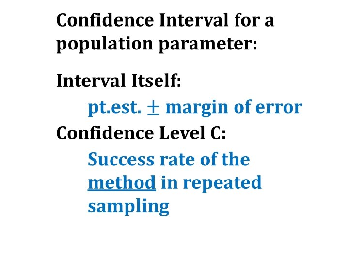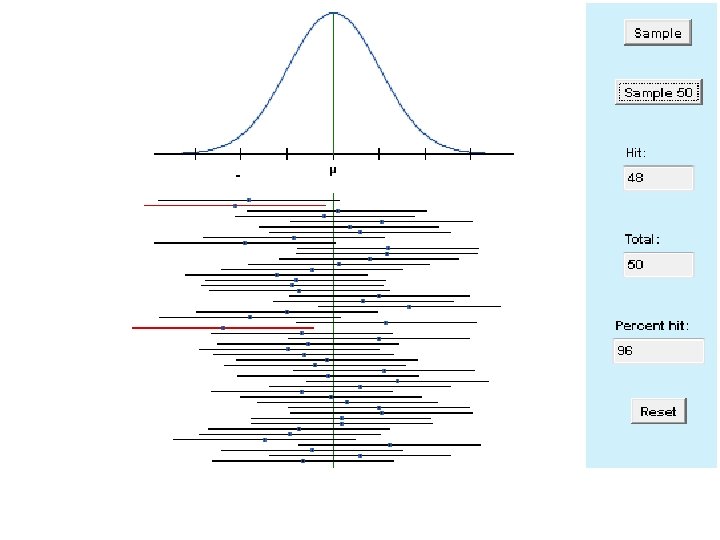 Observations about applet: Ø The center of each interval is the pt. est. Ø The dist. from pt. est. to either end of the interval is the margin of error Ø IF we created EVERY interval poss. then ______% of the intervals would contain pop. parameter