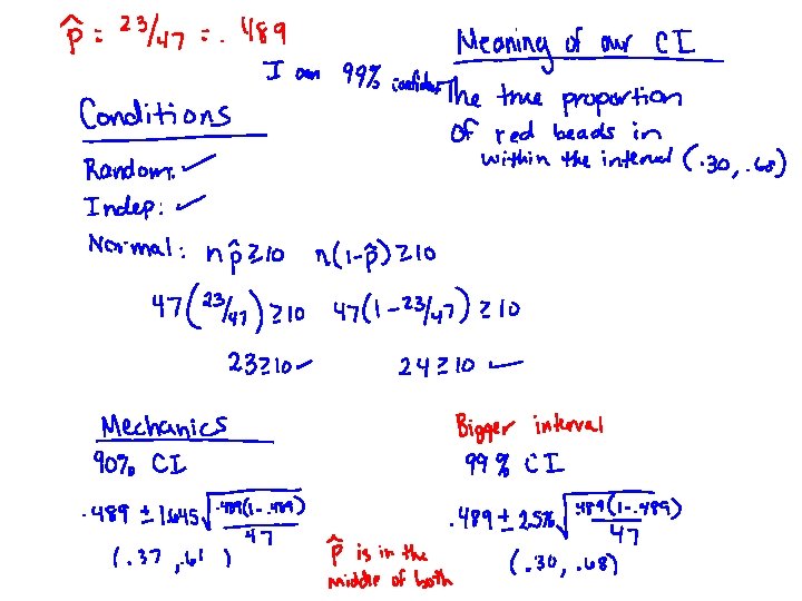 Create a 90% and 99% confidence interval for the proportion of red beads in the jar using your sample
