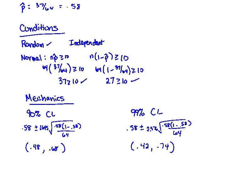 Interpreting!! Confidence Level How likely is our method to produce an interval that captures a parameter if we use it many times? Confidence Interval A set of plausible values for the pop. parameter