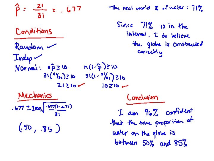 Globe Activity • What % of the time do we land on water with our left thumb? • Check conditions • Construct a 96% confidence interval
