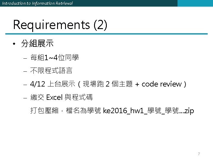 Introduction to Information Retrieval Chinese Keyword Extraction • Chinese keyword extraction is fundamental for many applications. • There are two major approaches – Need word segmentation 需先斷詞 – No word segmentation 不需先斷詞 2