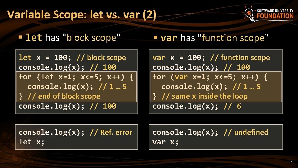 Variable Scope: let vs. var § let has "block scope" § var has "function scope" for (let x=1; x<=5; x++) console. log(x); // 1 … 5 console. log(x); // Ref. error for (var x=1; x<=5; x++) console. log(x); // 1 … 5 console. log(x); // 6 function test() { console. log(x); // Ref. error let x = 5; } test(); function test() { console. log(x); // undefined var x = 5; } test(); 45