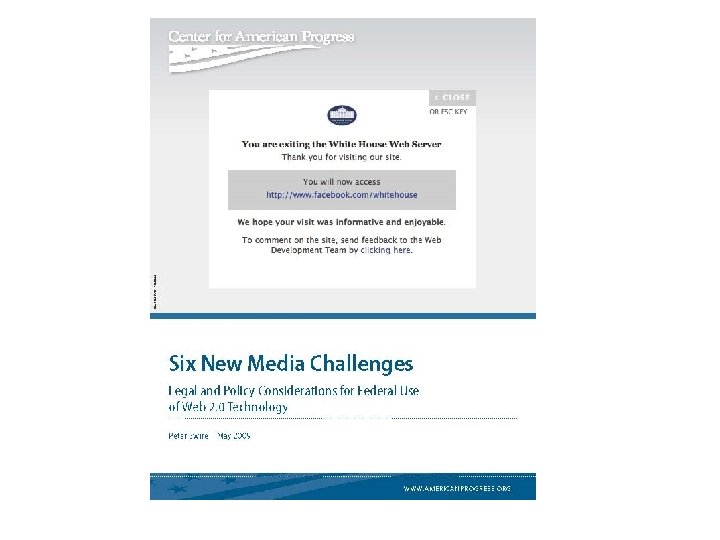 Six Legal Hurdles 1. Privacy 1. Persistent cookies 2. Data that goes to 3 rd party sites 2. Access for people with disabilities 1. Section 508 2. When does it apply to 3 rd party sites 3. Commercial endorsement & advertising