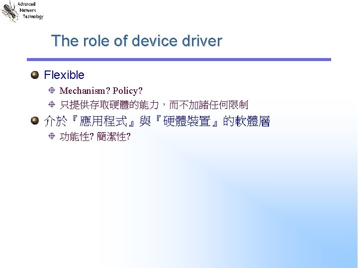 Demo example Source http: //www. oreilly. com. tw/chinese/linux/ldd 2. html http: //www. oreilly. com. tw/bookcode/ldd 2 -samples-1. 0. 2. tar. gz Make cd ~/ldd 2/misc-modules/ make clean; make Oops? cd /usr/include/ mv linux. orig ln –s /usr/src/linux/include/linux/ linux mv asm. orig ln –s /usr/src/linux/include/linux/acm/ asm Oops? Again make export. ver #include<slab. h> Run tail –f /var/log/messages insmod. /hello. o MODULE_LICENSE(“GPL”)