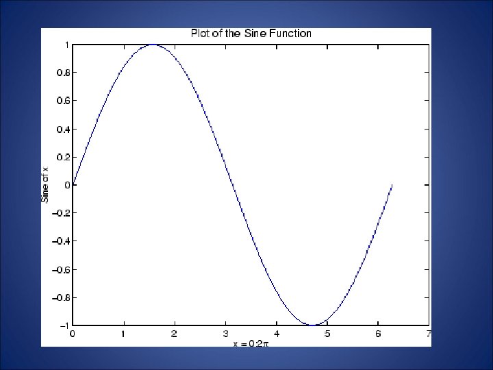 Basic Plotting Functions • The plot function has different forms, depending on the input arguments. • If y is a vector, plot(y) produces a piecewise graph of the elements of (y) versus the index of the elements of (y). • If you specify two vectors as arguments, plot(x, y) produces a graph of y versus x. • You can also label the axes and add a title, using the ‘xlabel’, ‘ylabel’, and ‘title’ functions. Example: xlabel('x = 0: 2pi') ylabel('Sine of x') title('Plot of the Sine Function', 'Font. Size', 12)