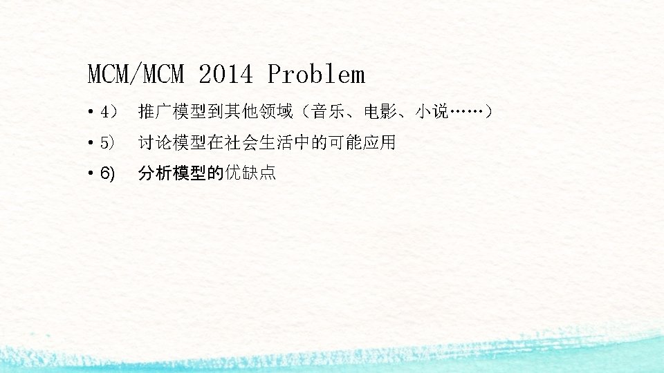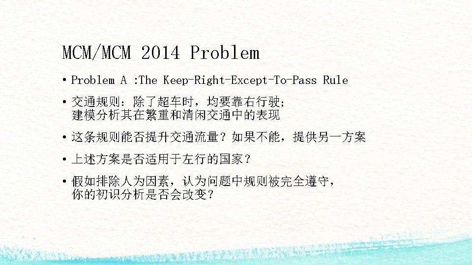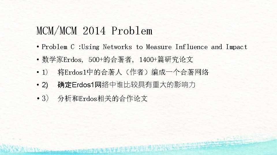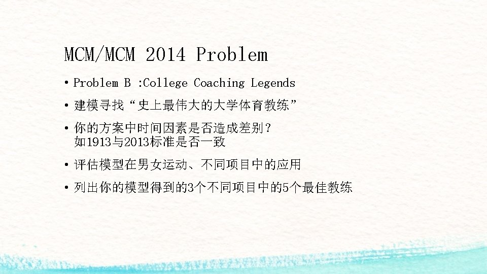 什么是MCM/MCM? • 2014 MCM (Problem A/B) : 6755 teams participated • 2014 ICM (Problem C) : 1028 Teams participated • 3本科生 / 96小时