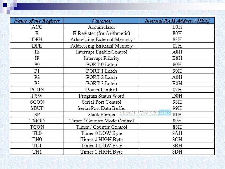 Special Function Registers (SFRs) Sort of control table used for running and monitoring the operation of the microcontroller. n Each of these registers as well as each bit they include, has its name, address in the scope of RAM and precisely defined purpose such as timer control, interrupt control, serial communication control etc. n