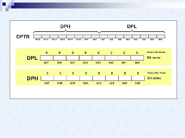 Data Pointer Register (DPTR) n n n DPTR register is not a true one because it doesn't physically exist. It consists of two separate registers: DPH (Data Pointer High) and (Data Pointer Low). For this reason it may be treated as a 16 -bit register or as two independent 8 -bit registers. Their 16 bits are primarily used for external memory addressing. Besides, the DPTR Register is usually used for storing data and intermediate results.