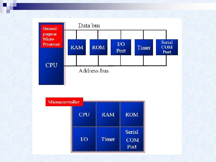 Microcontroller and General-Purpose Microprocessor computer system that comprise many elements. A microprocessor cannot be operated stand-alone , at the very least it require some memory and an output device to be useful. General-purpose microprocessors • No RAM (Random Access Memory) • No ROM (Read-Only Memory) • No I/O ports Microcontroller • • • CPU (microprocessor) RAM (Random Access Memory) ROM (Read-Only Memory) I/O ports Timer ADC and other peripherals