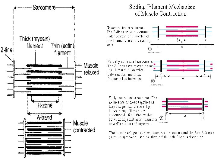 Sarcomeres • A sarcomere extends from Z-line to Z-line • I-Bands contain only thin filaments • A-Bands contain thick and thin filaments • H-Zone contain only thick filaments