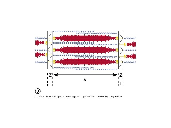 The Sliding Filament Mechanism • Myosin heads attach to and “walk” along the thin filaments at both ends of the sarcomere, progressively pulling the thin filament toward the center of the sarcomere.