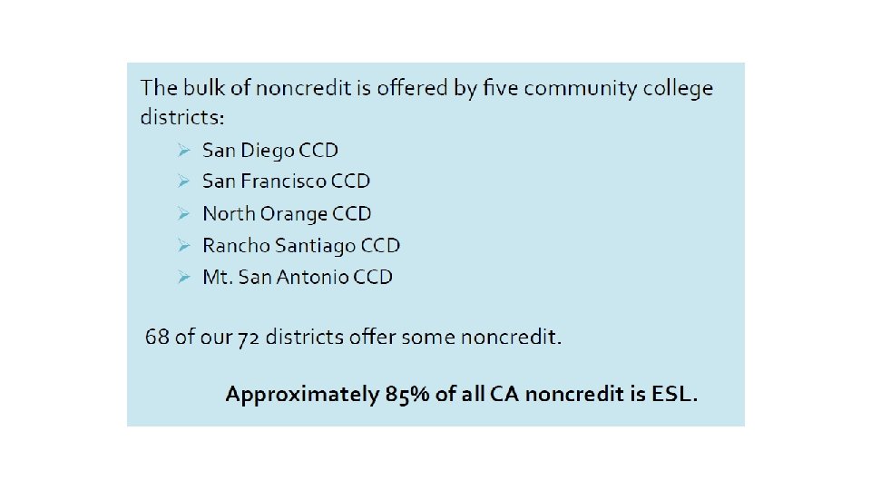 Restrictions • Open Courses • Ensure that noncredit course proposals do not appear to be closed to the public. Courses that are in conflict with the “open course” provisions of Title 5, section 51006 and section 58051. 5(a)(3), will not be approved by the Chancellor’s Office ESL