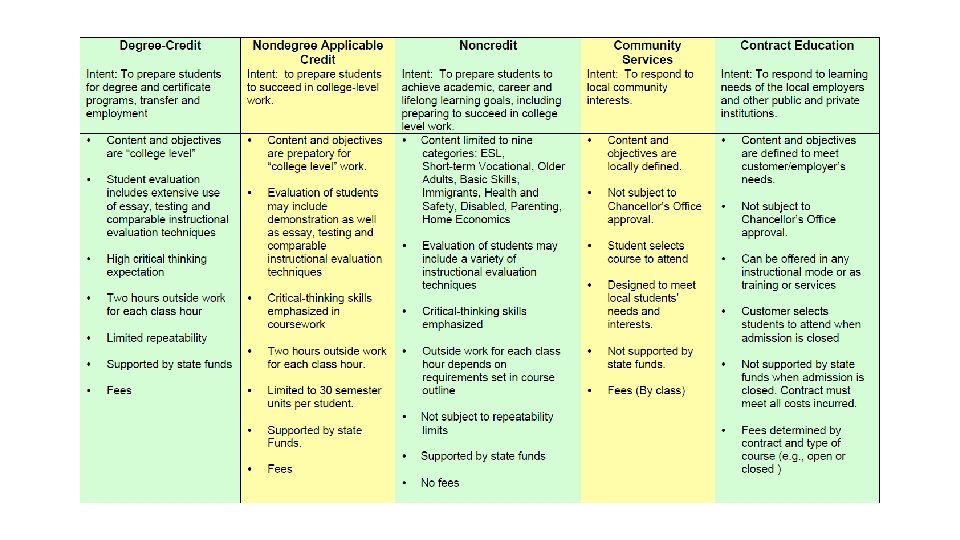 Credit Noncredit Degrees and certificates of achievement Unit bearing Designated lecture & lab hours Certificates of completion, competency Hour bearing No lecture or lab designation Grades (A-F or P/NP) Grades dependent on district (P/SP/NP, A-F)