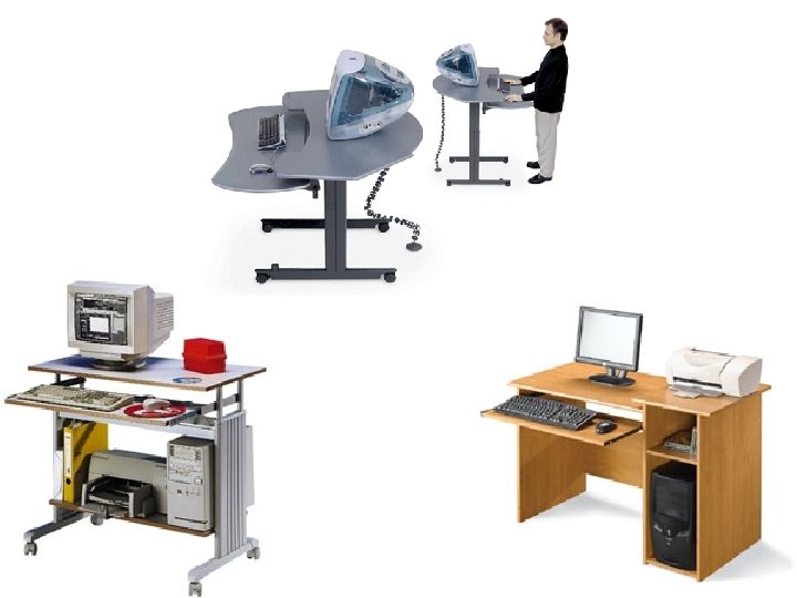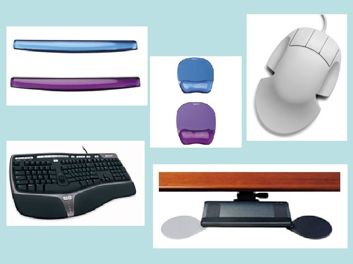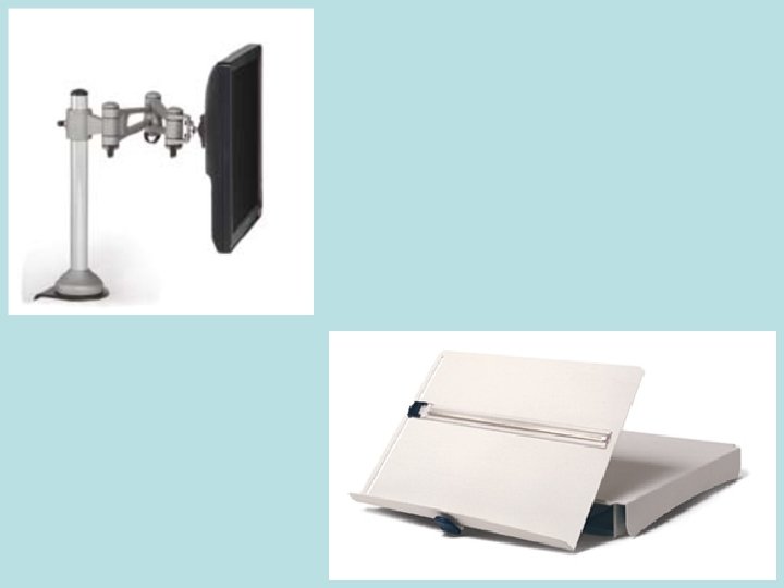 Laptops • Problems – – – Monitor attached to keyboard Not adjustable Compact keyboards Achieving proper setup is difficult Similar for PDAs/Black. Berry • Solutions – – – Docking station Independent mouse, keyboard and monitor Laptop holder Reduce use Desktop computer