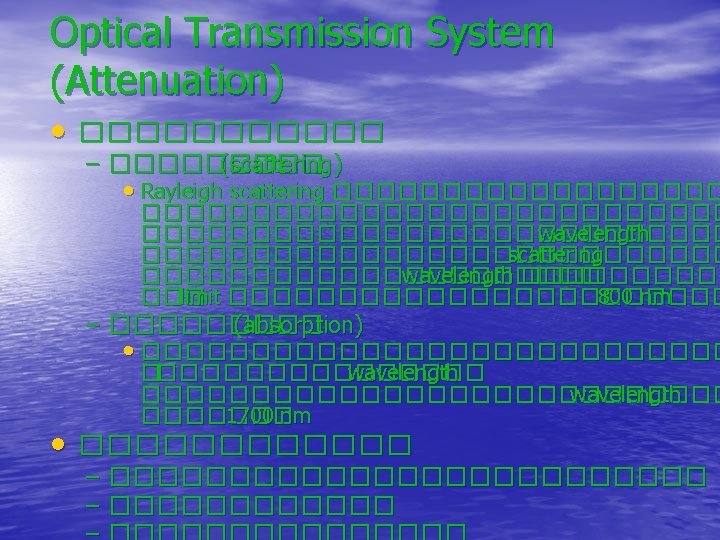 Optical Transmission System (Overview) • �������������� • �������������� (light source) ������������ lightemitting diode (LED) ��� laser diode ���� (Attenuation) – 1970: 20 d. B/km with purified glass – Current: 0. 2 d. B/Km • AT&T first standardized transmission at DS 3 speed • (45 Mbps) with multimode fiber �������������� single-mode fiber �������������� multimode fiber ����� Optical Spectrum – 850 nm