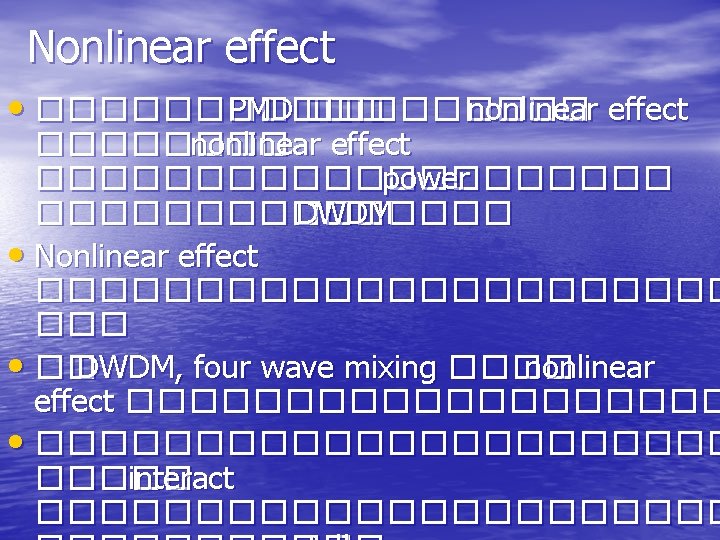 Polarization Mode Dispersion (PMD( Ey nx Ex ny Pulse As It Enters the Fiber • pulse Spreaded Pulse As It Leaves the Fiber ������������ PMD ������ chromatic dispersion ������������ bit rates 10 Gb/s ������