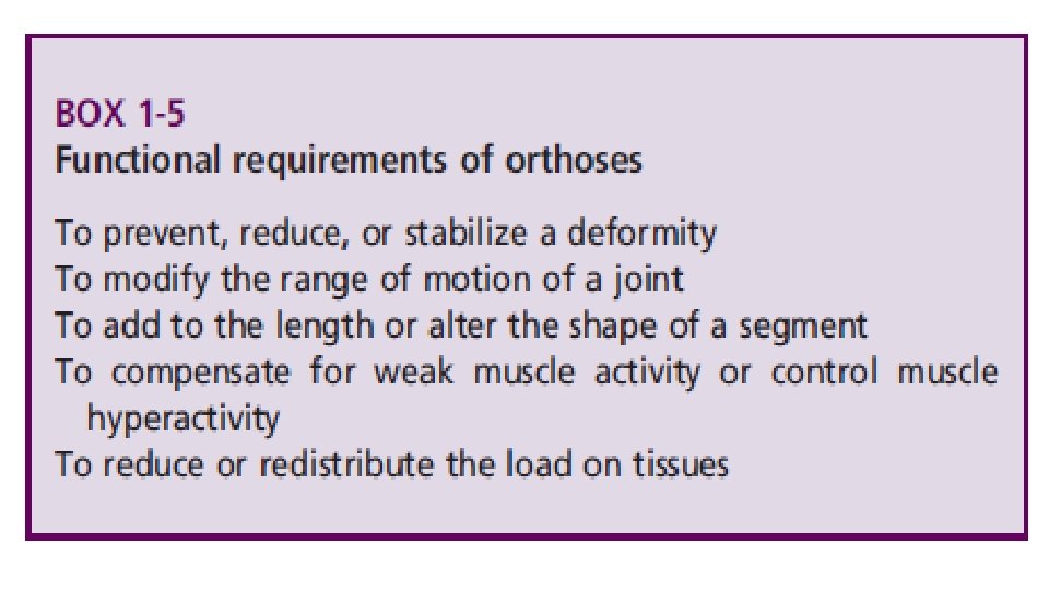 (ISO)2003: CONTINUE………… • The final segment of the standard describes the method and the terms to be used to describe the ‘‘functional requirements of the orthosis’’ necessary to achieve the previously defined clinical objectives. • The five categories identified are listed in Box 1 -5. • The reason adoption of this two-stage approach was considered necessary to the development of what is in effect the orthotic prescription is best illustrated by looking at an example of the use of the standard. • One of the clinical objectives of the orthotic treatment of a person who suffers from a degenerative joint disease might be to relieve pain. • Depending on the location and severity of the condition, the functional requirements of the orthosis used to achieve this objective might be to prevent, reduce, or stabilize a deformity; to limit the range of a joint; or to reduce or redistribute the load on particular tissues.