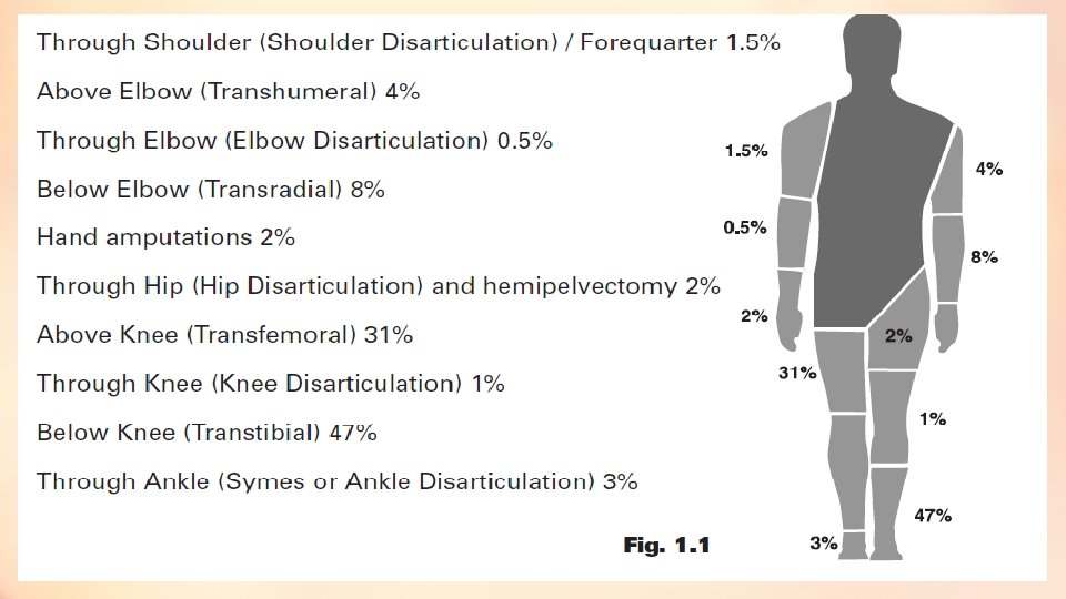 Continue……………… • Amputation – taking away of a body extremity by surgery or trauma. • Bulbous – Refers to the residual limb being larger in circumference at the end than at the top. • Functional Level – Degree of function a disabled patient still achieves. • Gait – Walking. • Thoracic – Related to the trunk/rib cage. • Hemipelvectomy – A high-level pelvic amputation. • Hip Disarticulation – Amputation of the entire leg from the hip. • Syme’s amputation – An amputation performed at the ankle joint • Transfemoral – A type of amputation that occurs above the knee. • Transhumeral – A type of amputation that occurs above the elbow. • Transradial – A type of amputation that occurs at the forearm. • Transtibial – A type of amputation that occurs below the knee.
