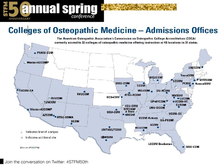 Today… • Today, more than 20 % of medical students in the United States are training to be osteopathic physicians. • 33 osteopathic medical schools in US • Sixty percent of current US osteopathic medical school graduates practice primary care, compared to 20% of current US allopathic graduates. • Most of these are in Family Medicine, followed by Internal Medicine and Pediatrics. http: //www. aacom. org/become-a-doctor/about-om Accessed 3/29/17