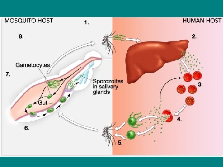 Life cycle: Mosquito bite Plasmodium develops in the gut of mosquito and is passed on in the saliva of an infected insect sporozoits are carried by blood to the victim's liver where they form cyst-like structure containing thousands of merozoits After 9 -16 days they return to the blood and penetrate the red cells, where they multiply again, progressively breaking down the red cells This induces bouts of fever and anemia in the infected individual. In cerebral malaria, the infected red cells obstruct the blood vessels in the brain. Other vital organs can also be damaged often leading to the death of the patient.