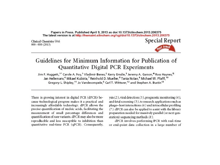 MIQUE Nomenclature • MIQUE - Minimum Information for Publication of Quantitative Real-Time PCR experiments Suggested nomenclature • • Reference genes not housekeeping genes Quantification not quantitation Hydrolysis probes not Taq. Man probes Quantification cycle Cq replaces Ct, Cp, TOP