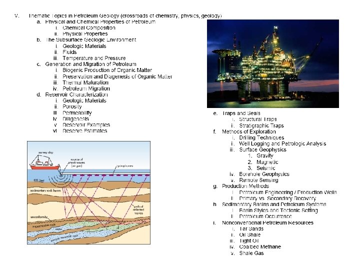 Organic Sediment: Marine vs. Non-Marine Bitumen – soluble organic matter Kerogen – insoluble organic matter Marine Organics: algal, soft parts, petroleum generation Terrestrial Organics: woody plants, gas generation Mixed Marine-Terrestrial: waxy oil-gas mix Conditions for petroleum accumulation: 1. Organic source rock 2. Sediment burial and thermal maturation (heating over time) 3. Permeable and Porous reservoir rock to store fluids 4. Cap rock or impermeable seal to contain buoyant fluids 5. Favorable geometric arrangement between reservoir and seal