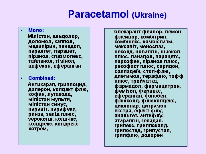 Ukraine: 128 preparations of Diclofenac-sodium, 60 – Paracetamol (Acetaminophen) For each drug - only single international name and different trade names