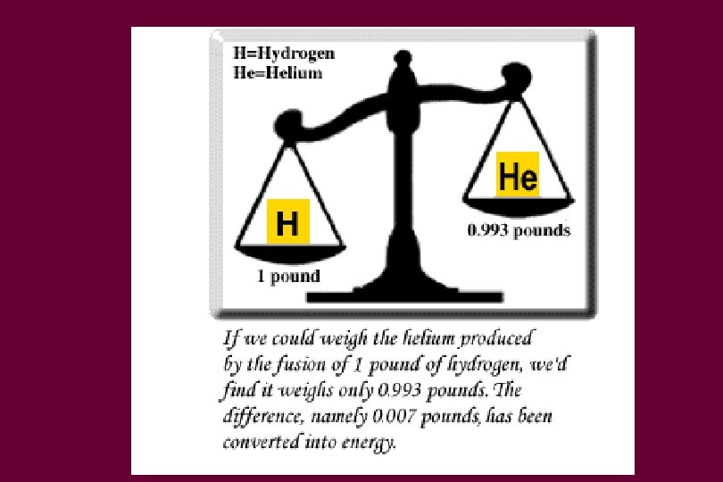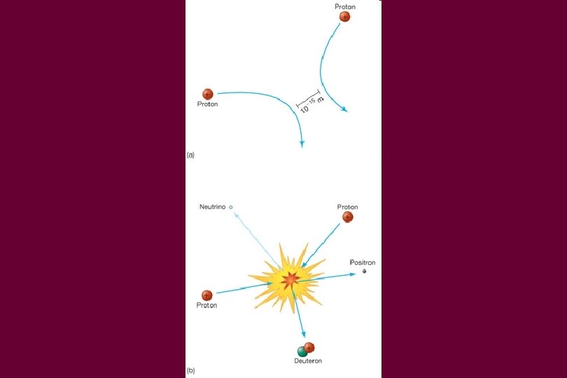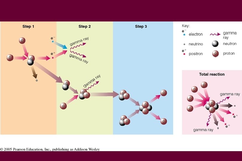 Reaction • 4 protons → helium-4 + 2 neutrinos + energy Neutrino-virtually massless, chargeless particles Positron-positively charged electron – annihilated immediately by colliding with an electron to produce energy