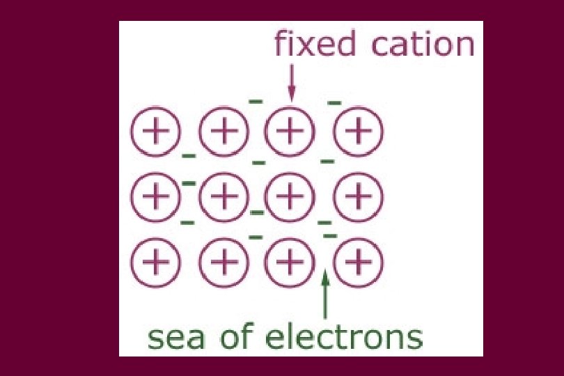 Metallic Bonds • A chemical bond in which positively charged metal ions are held together within a “fluid” • Electromagnetic interaction between conduction electrons and gathered in an "electron sea“ • Atoms "share" electrons that float about in a general electron cloud