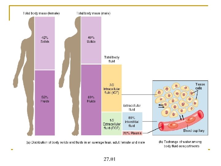 Homeostasis and Body Fluids n Maintaining the volume and composition of body fluids are important q Body fluids are defined as dilute, watery solutions containing dissolved chemicals inside or outside of the cell q Intracellular Fluid (ICF) n Fluid within cells q Extracellular Fluid (ECF) n Fluid outside cells n Interstitial fluid is ECF between cells and tissues