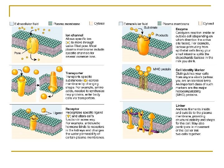 Functions of Membrane Proteins n n n Some integral proteins are ion channels Transporters - selectively move substances through the membrane Receptors - for cellular recognition; a ligand is a molecule that binds with a receptor Enzymes - catalyze chemical reactions Others act as cell-identity markers