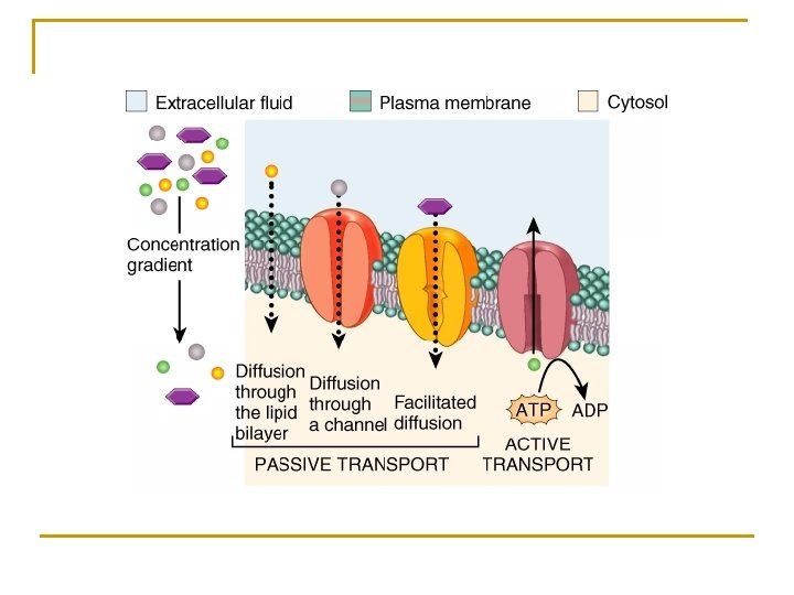 Passive vs. Active Processes n n Passive processes - substances move across cell membranes without the input of any energy; use the kinetic energy of individual molecules or ions Active processes - a cell uses energy, primarily from the breakdown of ATP, to move a substance across the membrane, i. e. , against a concentration gradient