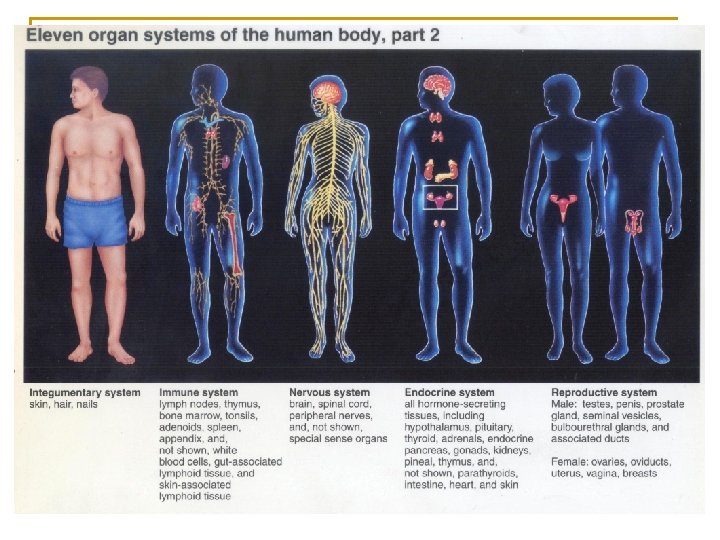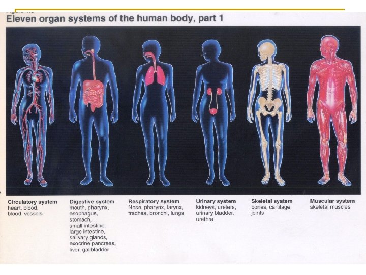 Levels of structural organization n SYSTEM LEVEL q A system consists of related organs with a common function q Organ-system level n Digestive system breaks down and absorbs food n It includes organs such as the mouth, small and large intestines, liver, gallbladder, and pancreas n Eleven systems of the human body