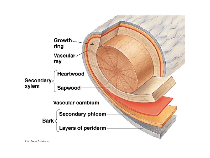 Concept 35. 4 Secondary growth adds girth to stems and roots in woody plants • Involves lateral meristems – Vascular cambium: produces secondary xylem (wood) – Cork cambium: produces tough covering that replaces epidermis • Bark = all tissues outside vascular cambium
