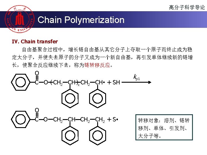 高分子科学导论 Chain Polymerization III. Chain termination (2) 歧化终止 (Disproportionation): 某链自由基夺取另一链自由基相邻碳原子上的氢 原子或其它原子的终止反应。 O C O ( CH 2 CH )x CH 2 CH O + CH CH 2 ( CH CH 2 )y O C ktd O C O ( CH 2 CH )x CH 2 O + CH CH ( CH CH 2 )y O C