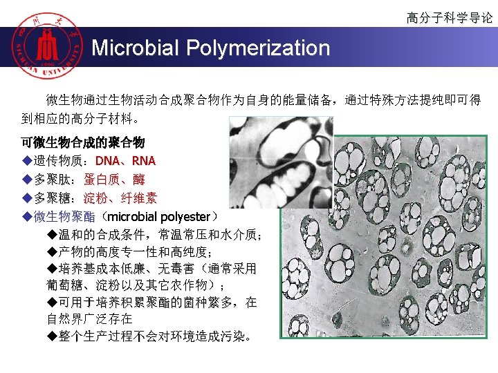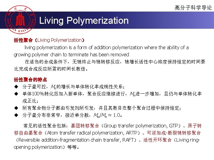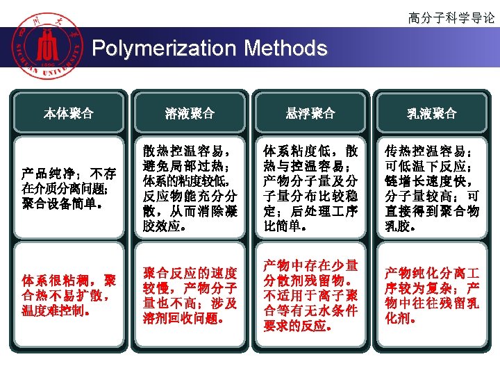 高分子科学导论 Polymerization Methods u 界面聚合 (Interface polymerization) u 固相聚合 (Solid polymerization) u 超临界流体聚合 (Polymerization in supercritical fluids) u 辐射聚合 (Radiation polymerization) u 等离子体聚合 (Plasma polymerization) u 微波聚合 (Microwave-assisted polymerization) u 超声波聚合 (Ultrasonic-assisted polymerization)